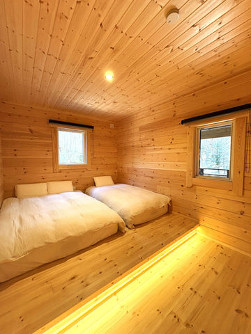 寝室は二部屋ございます。各部屋には、シモンズのシングルとダブルサイズのベッドマットをご用意しました。一部屋には、3名様までお泊りいただけます。小上がりの部分に設置した間接照明が、おやすみ前の穏やかな時間を演出します。