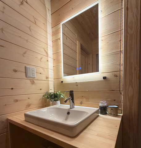 浴室・洗面所は、スタイリッシュなイメージに仕上げました。洗面所の扉を開けると、サウナエリアに直接出ることができます。サウナ後に、すぐに浴室をご利用いただける動線になっております。